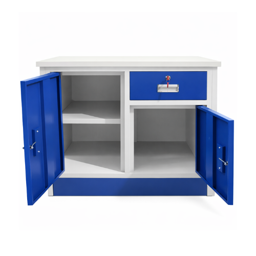 The cabinet features two spacious lockable doors that open to a large storage compartment, ideal for storing tools, equipment, supplies, or documents. A top drawer with an individual lock provides quick access to smaller items while keeping them safe and organized. The sturdy flat top surface can also be used as a small workbench or additional storage space.