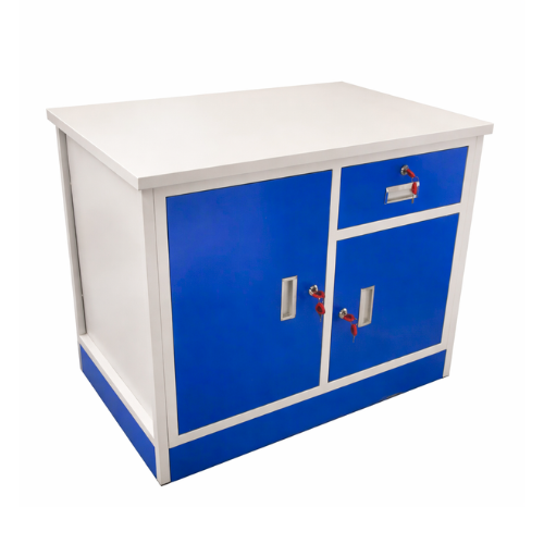 Finished in a clean white body with blue doors, this cabinet adds a modern and professional look to any workspace. The integrated handles and secure locking system ensure convenience and safety.