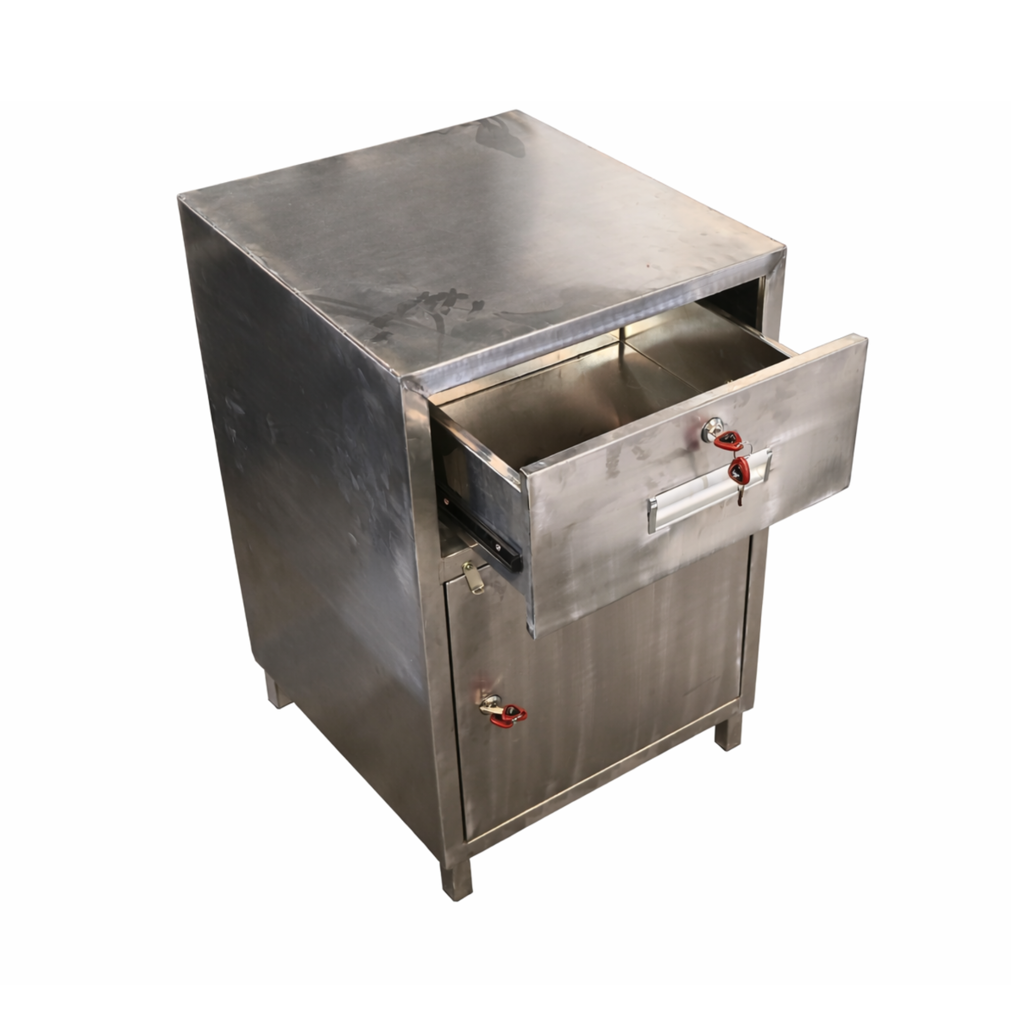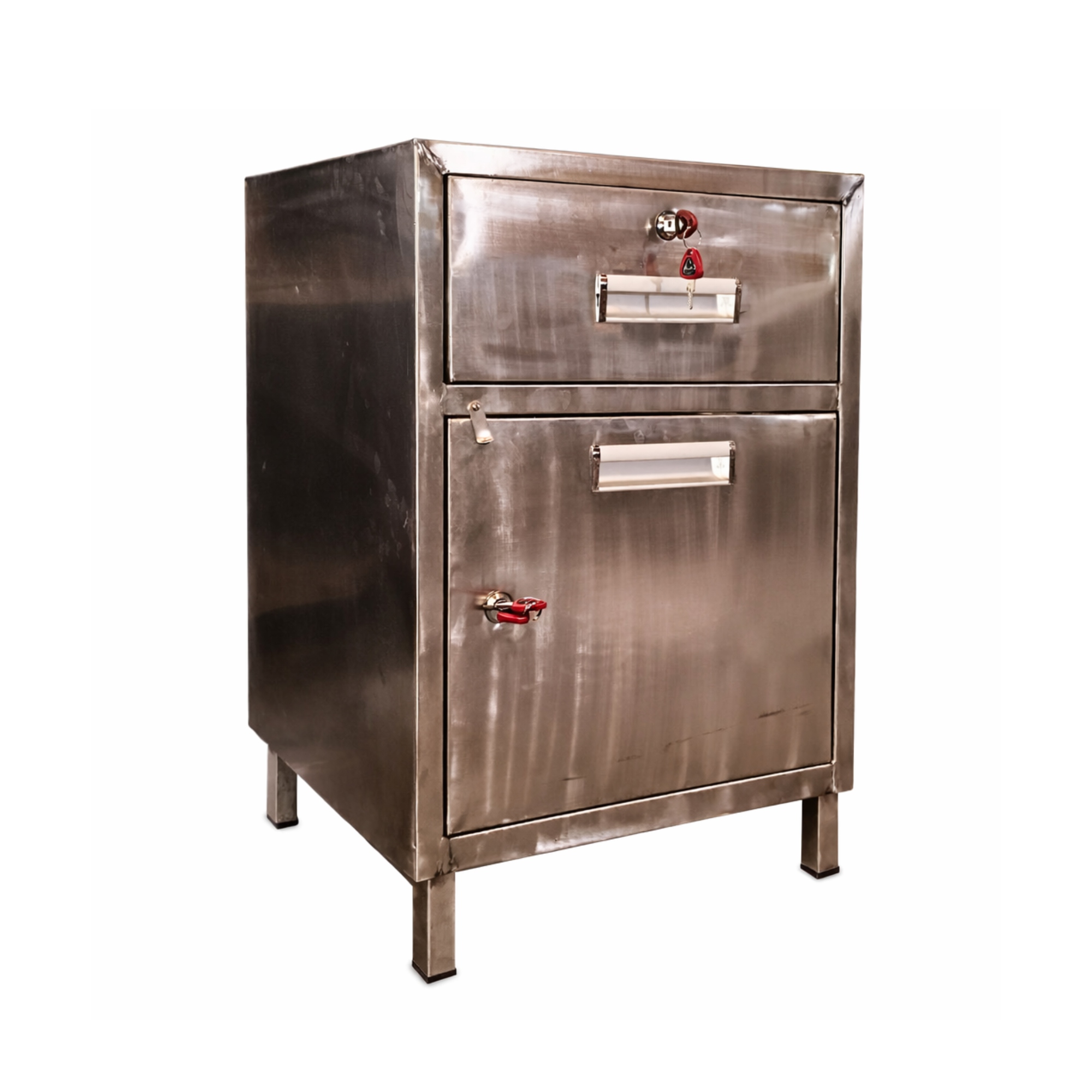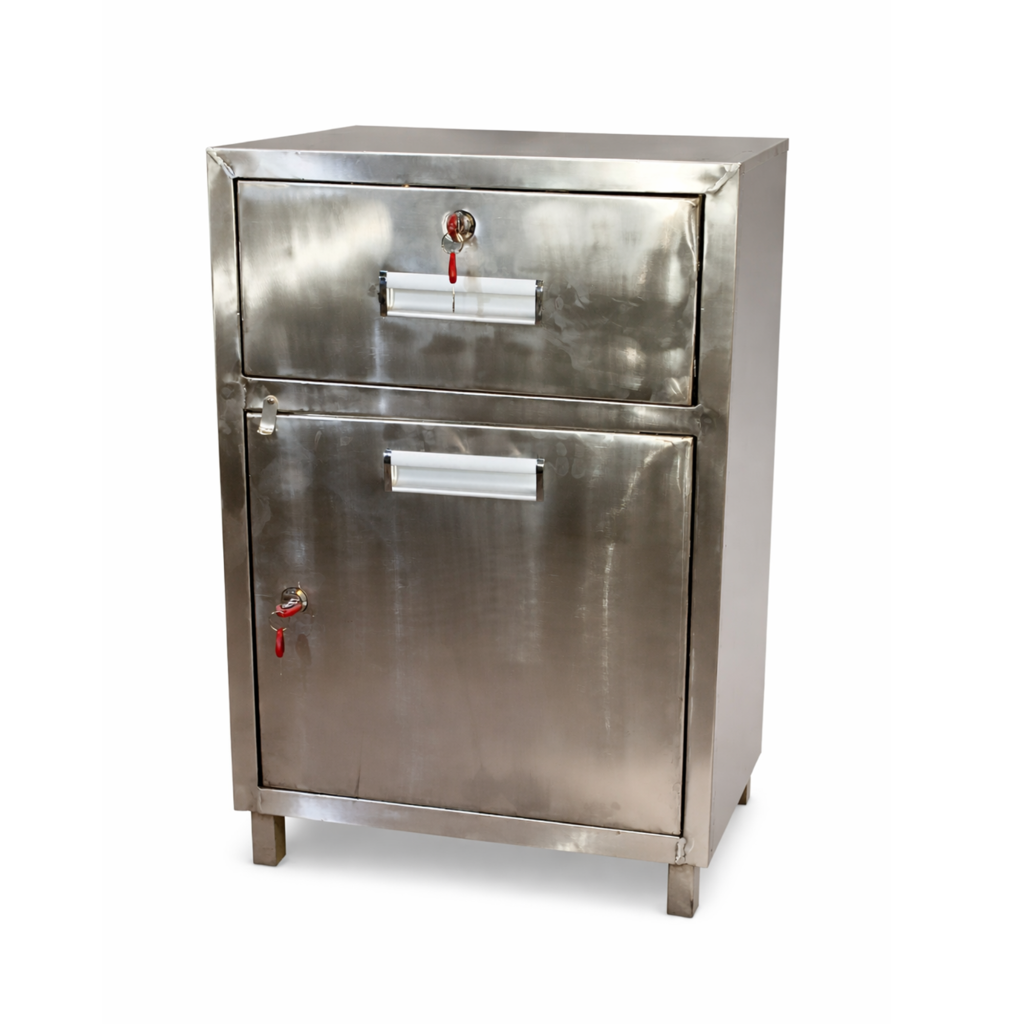 The cabinet features a spacious top drawer for organizing small tools, documents, or accessories, while the large lower compartment provides ample space for storing equipment and supplies. Both sections are equipped with secure locking systems to ensure safety and controlled access. The smooth stainless steel surface makes cleaning easy and helps maintain a hygienic workspace.
